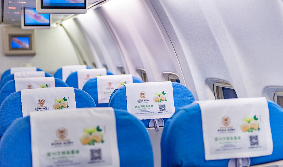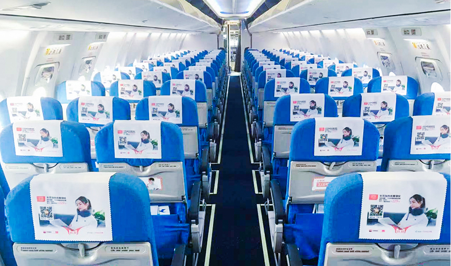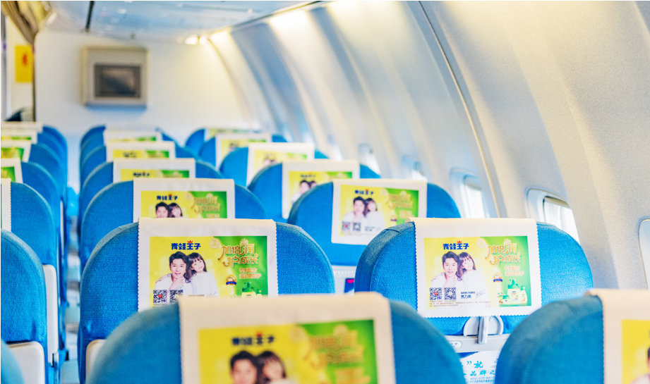 一進(jìn)入機(jī)艙,每個(gè)座椅上醒目統(tǒng)一的頭片廣告,全艙集中呈現(xiàn),營造出一種沖擊力極強(qiáng)的視覺